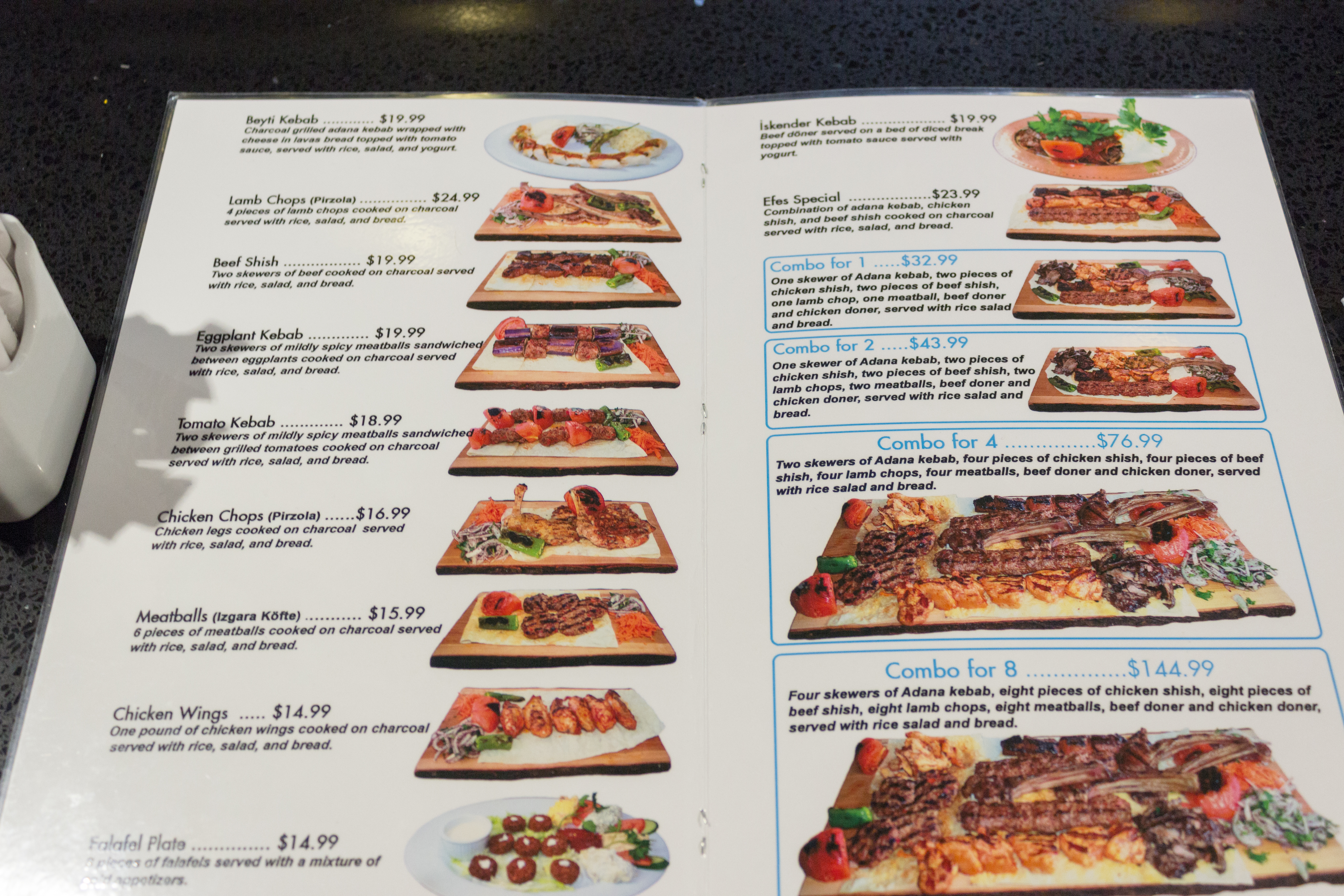 Let’s get to the meals! The main course range from kebabs to pides (Turkish pizzas) to lamb chops and more. The ones we got were the Efes special and combo for 2. The Efes special was a combination of Adana kebab, and chicken and beef shish all cooked on charcoals. Whereas, the combo for 2 had the same items as the Efes special, plus: lamb chops, meatballs, and chicken and beef doner (similar to shawarmas). Perfect for the meat lovers. All the main entrees were served with rice, salad, grilled peppers and onions and thin pita beard, all served on a wooden plate.